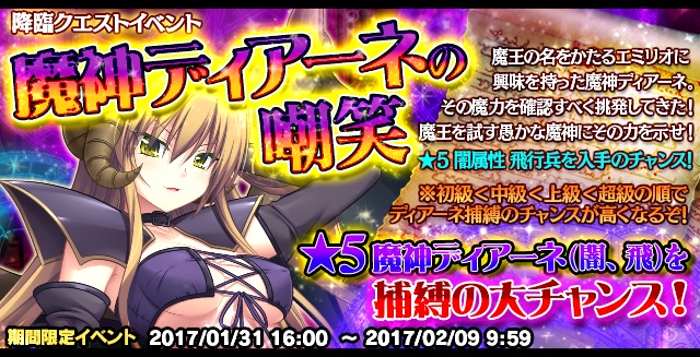 | 超級 | 40 | 1000 (25) | 2000 (50) | 2,500エリン 5,000エリン 火のクリスタル(小)×1 木のクリスタル(小)×1 光のクリスタル(小)×1 闇のクリスタル(小)×1 火のクリスタル(中)×1 水のクリスタル(中)×1 | 10,000エリン 20,000エリン 闇の属性石(大)×1 闇のクリスタル(大)×1 魔神ディアーネ クリスタル(特大)×1<固定> |